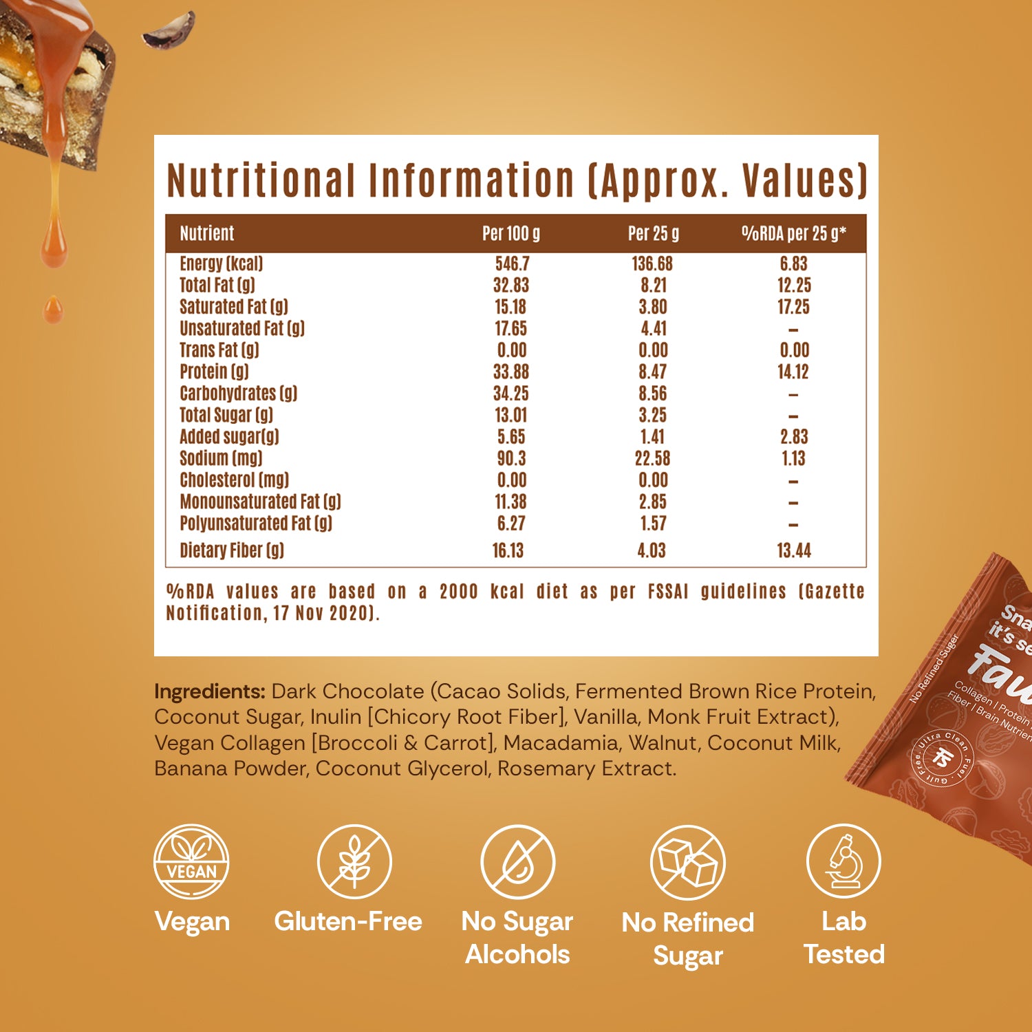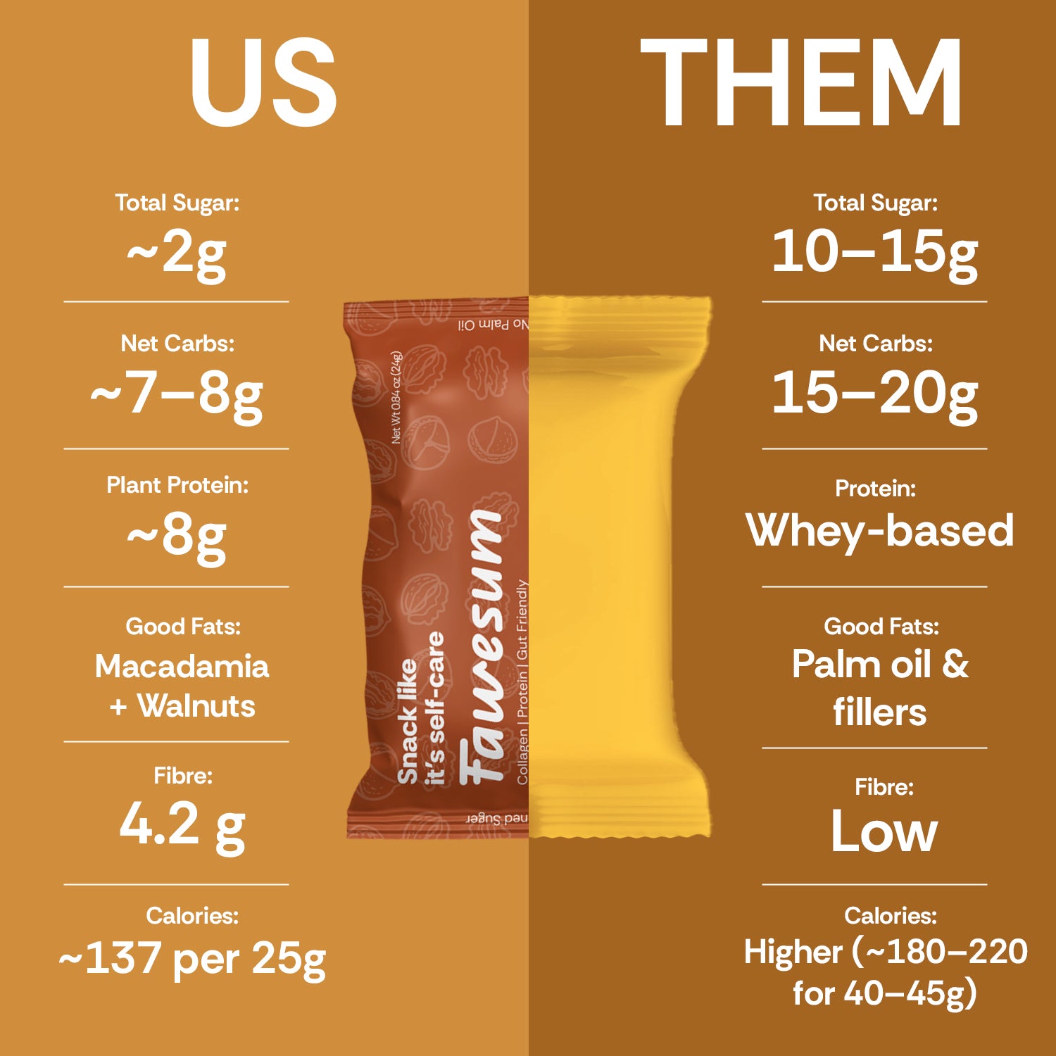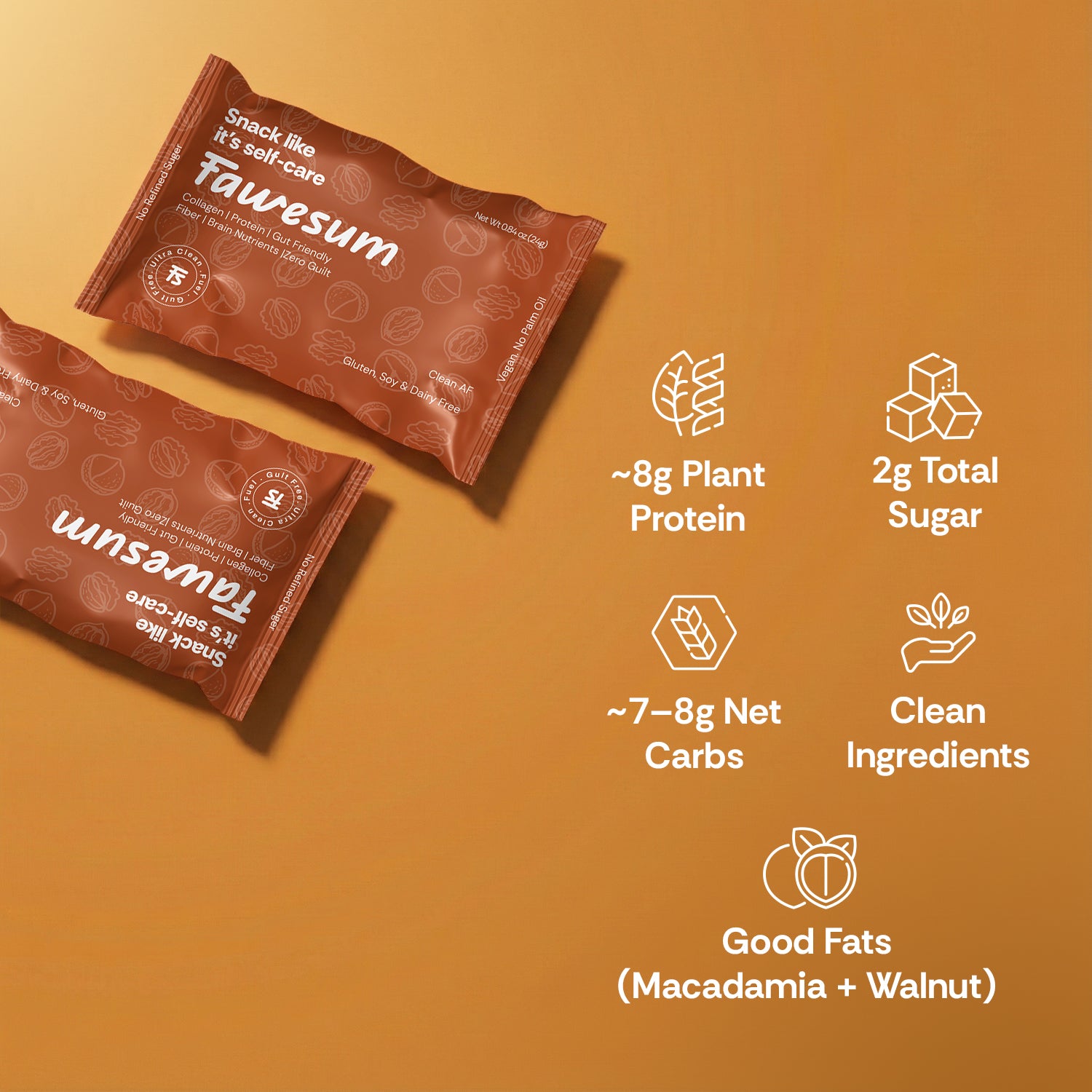 Meet your mid-day sweet fix that actually loves you back. Fawesum Craving Killer is your clean, functional snack bar loaded with 5g of plant-based protein and 5g of vegan collagen to support skin, joints, and recovery. Made with rich macadamia nuts, crunchy walnuts, and lightly sweetened with low-GI coconut sugar — this bar satisfies without the crash.